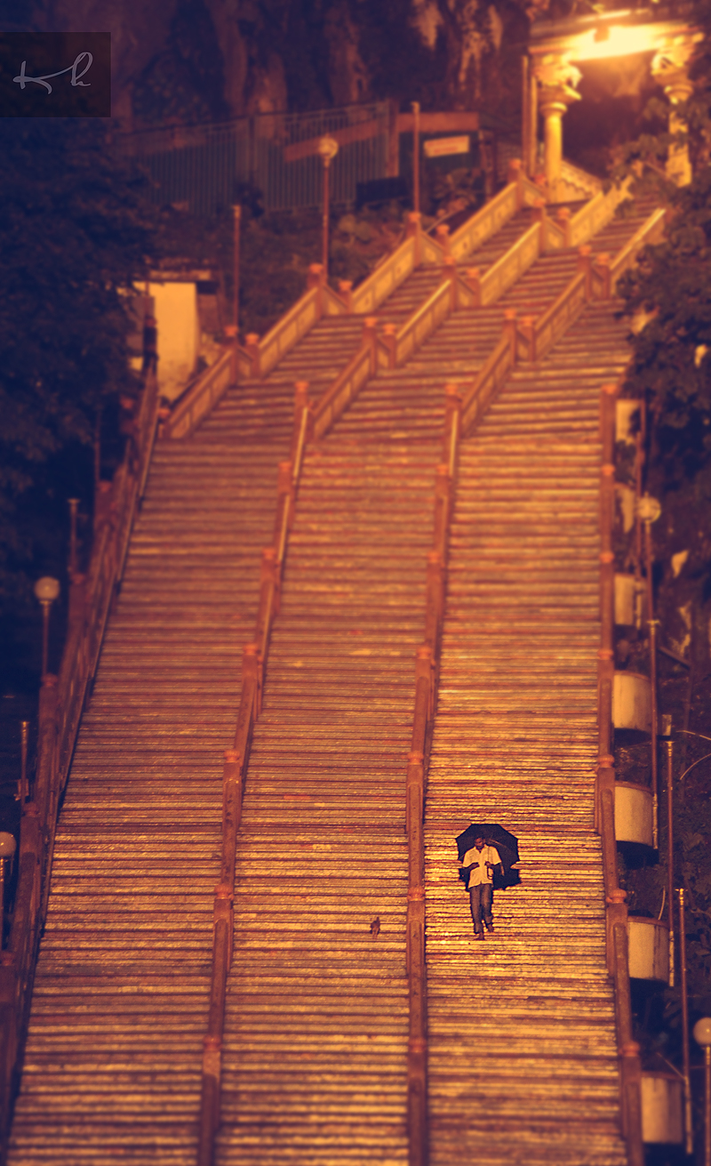 Seorang lelaki dan seekor kucing sedang menuruni tangga di Batu Caves setinggi 272 anak tangga pada malam sebelum menyambut Deepavali. -KH/Malaysia